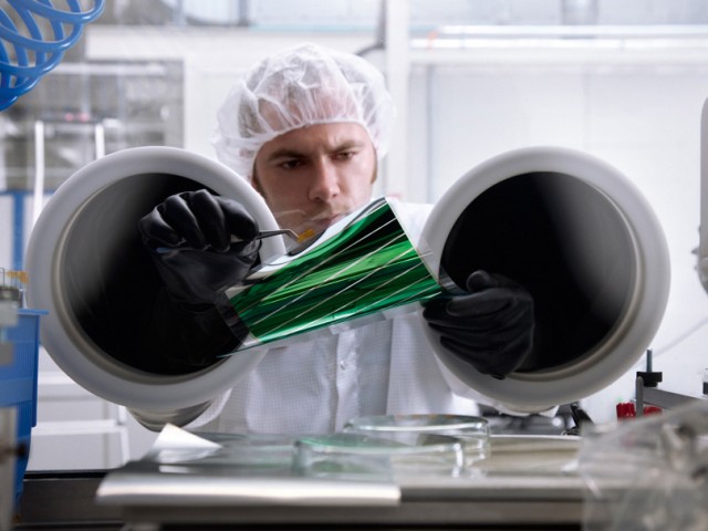 Dünn, leicht und biegsam – die Zukunft der Solartechnologie liegt in der organischen Fotovoltaik. Die innovativen, leichten und flexiblen Solarmodule der Dresdner Firma Heliatek nutzen Sonnenenergie überall dort, wo sie gebraucht wird. Mittels einer patentierten Tandemzellentechnologie, bei der zwei organische Solarzellen übereinandergestapelt arbeiten, wird ein breites Sonnenspektrum mit nur 500 Nanometer dünnen, aktiv arbeitenden Schichten aufgenommen. Derartige Module können auch an Orten eingesetzt werden, für die die üblichen Solarmodule zu schwer oder zu unhandlich sind. So sind sie besonders für die Integration in Fassaden oder Fahrzeuge geeignet oder für mobile Anwendungen.