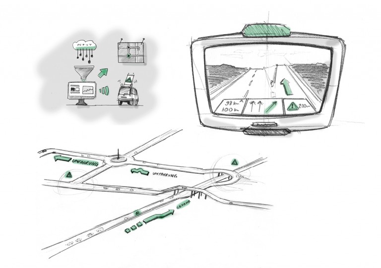 Die Idee geht deshalb einen Schritt weiter. Ähnlich wie bei der stundengenauen Wettervorhersage, sollen verschiedene Datenquellen verknüpft werden, um mit komplexen Algorithmen eine Prognose zu erstellen, wo und wann Verkehrsbehinderungen am wahrscheinlichsten auftreten können. Diese Prognose fließt dann direkt an die zuständigen Behörden, um ihnen zu ermöglichen an den definierten Stellen den Verkehr zu steuern/beeinflussen, wo die Gefahr am größten ist. Die Idee setzt dabei auf unterschiedliche Geodaten, Echtzeitdaten der Verkehrslage sowie Daten zu externen Faktoren. Mit Sensordaten aus Fahrzeugen (FCD), kann das Modell mit noch genaueren Informationen verbessert werden.